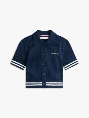 Add a touch of heritage sporting style to weekend outfits with this short-sleeve cardigan, featuring a polo collar and stylish rib-knit texture.