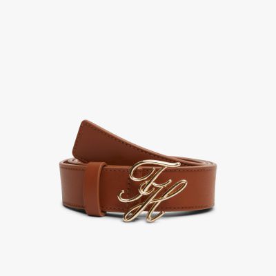 This smooth leather belt showcases a script logo plaque buckle for an amped-up sense of luxury and elegance.