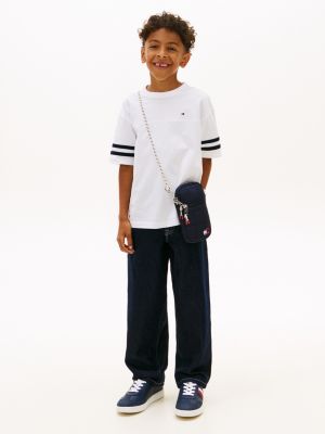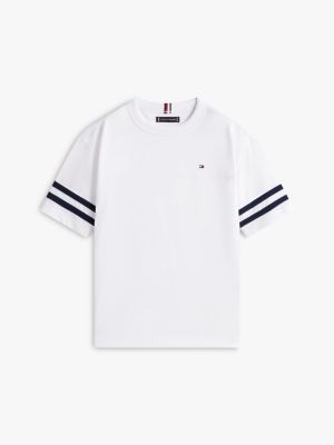 Bring a sporty vibe to weekend activities with this pure cotton jersey T-shirt, featuring bold, varsity-inspired stripes on the sleeves.