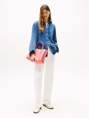 This tote bag with a flat pebble-grain finish has both carry handles and a tonal crossbody strap for multiple ways to wear.