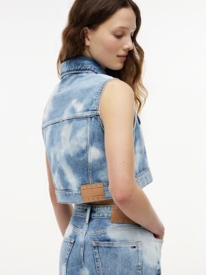A playfully cropped, sleeveless iteration of the classic trucker jacket, this vest captures sunny-day vibes in tie-dyed and bleached denim.